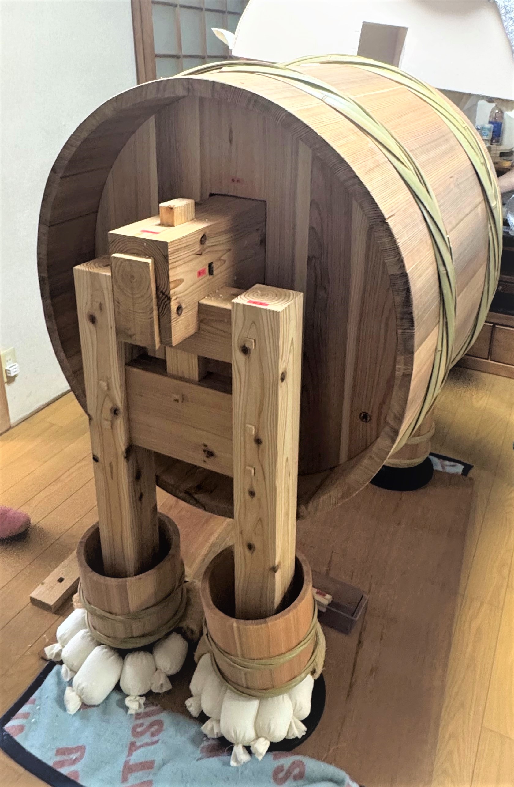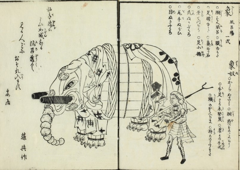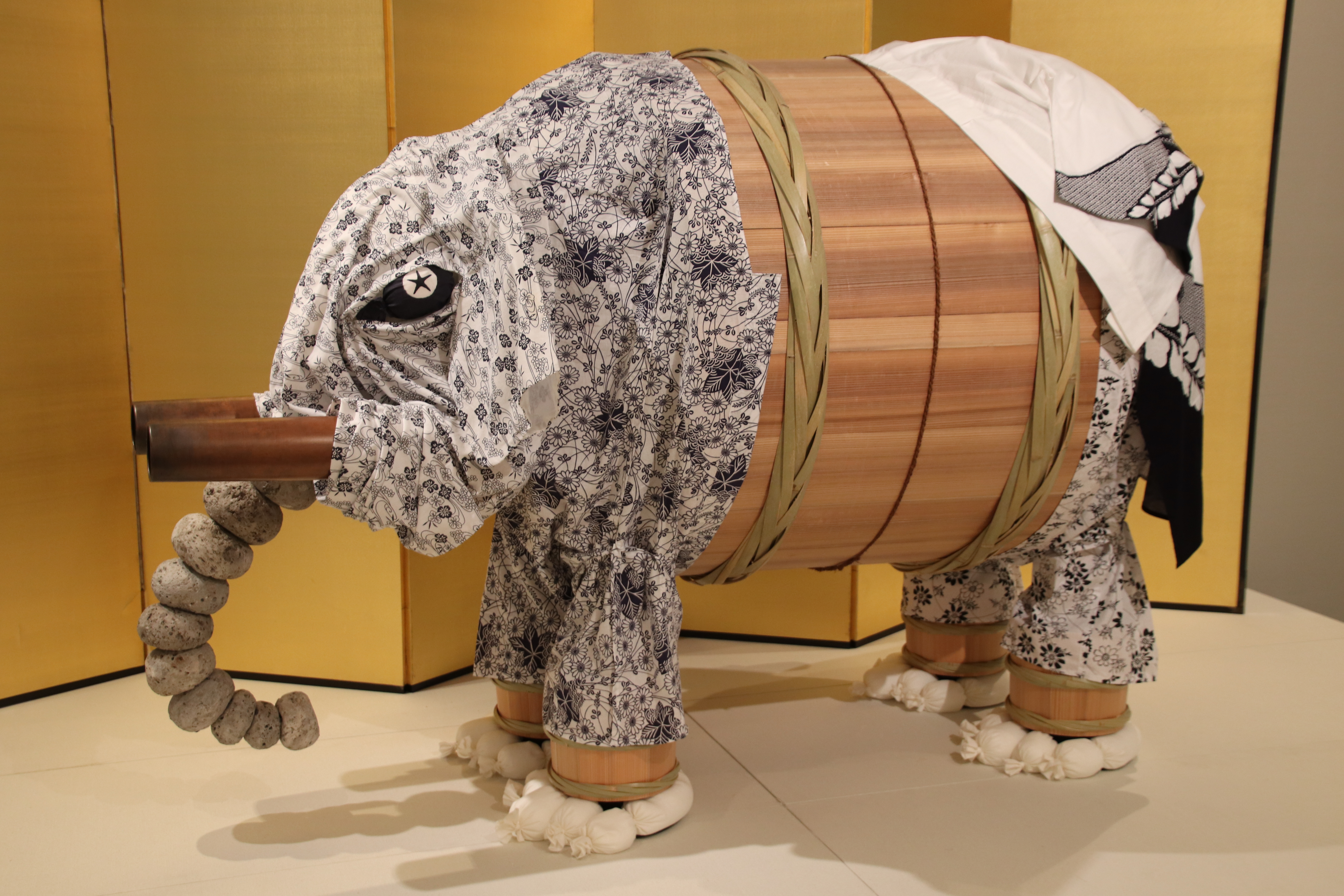 よく見ると、頭は浴衣、胴体は五右衛門風呂の桶、鼻は軽石、牙は湯沸かし用の鉄砲、足は小桶、目と爪は体を洗うぬか袋、そして尾は手拭いと、すべて江戸時代の風呂場で使われていた道具一式でできています。これらを組み合わせて、象の姿に見立てて作られているのです。