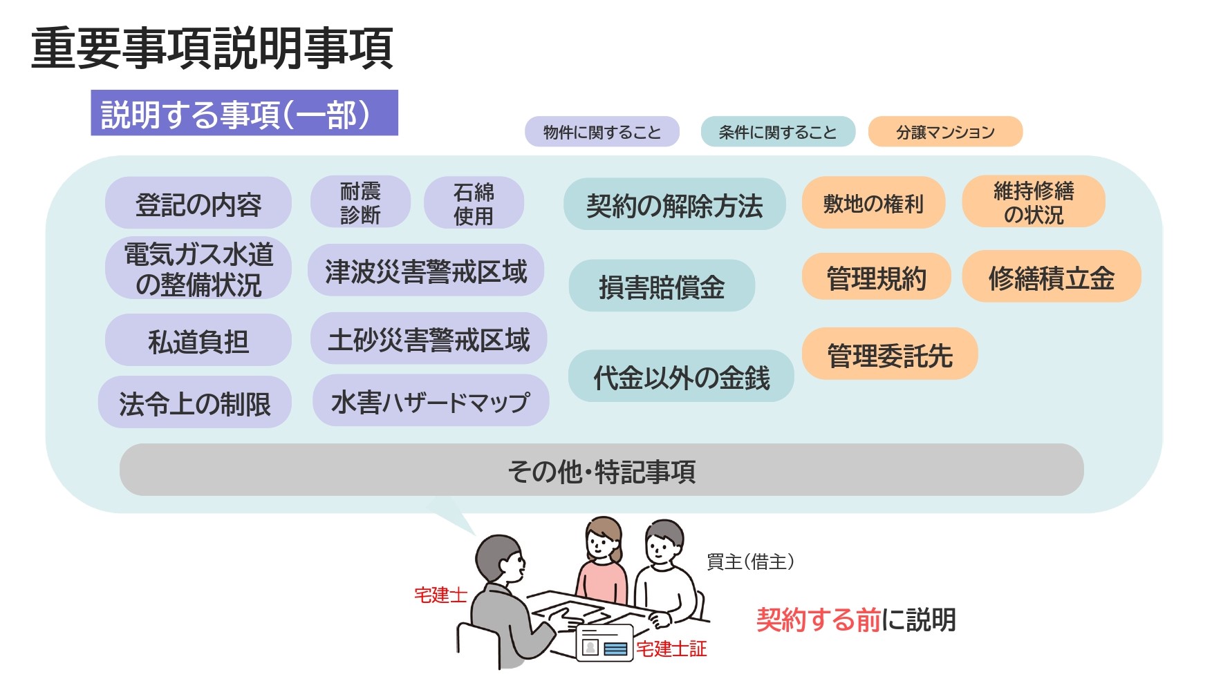 説明時に提示される書面が、「重要事項説明書」です。物件に関することや契約条件などが具体的に記載されています。例えば、登記内容やライフライン設備の状態といった物件に関することのほか、契約解除の方法、代金以外に必要な費用、分譲マンションであれば管理規約や維持修繕の状況に関することなどです。