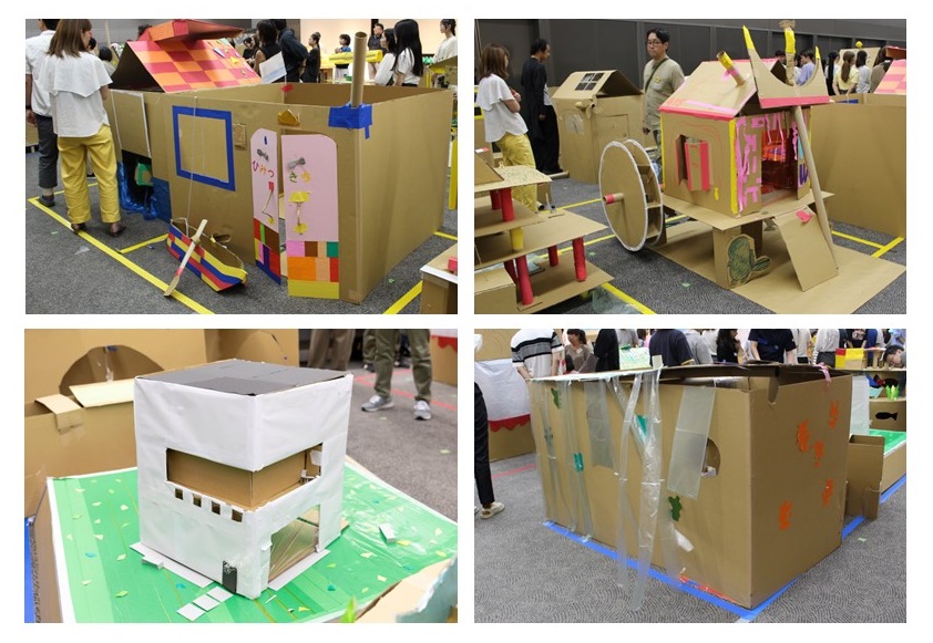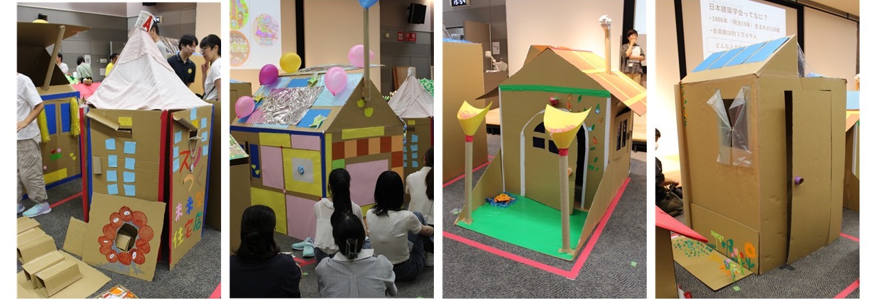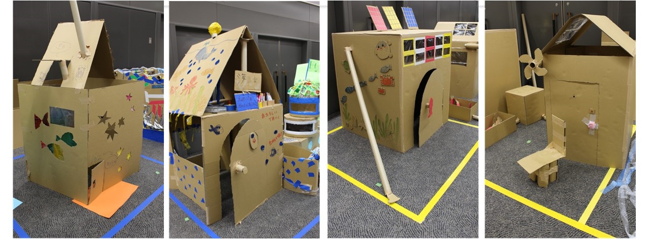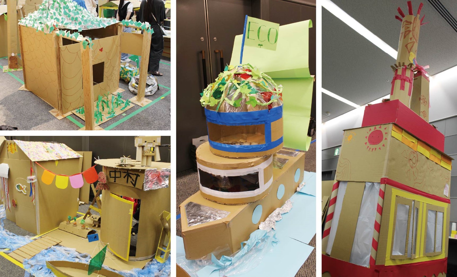 1日目は万博や世界のまちについて学ぶところからスタート。その後、「海」「太陽」「川」「山」の4つのグループにわかれて、それぞれのテーマから考えた造りたい家をスケッチした。そしてダンボールなどを材料に、2日目と合わせておよそ5時間かけて家を造り上げた。