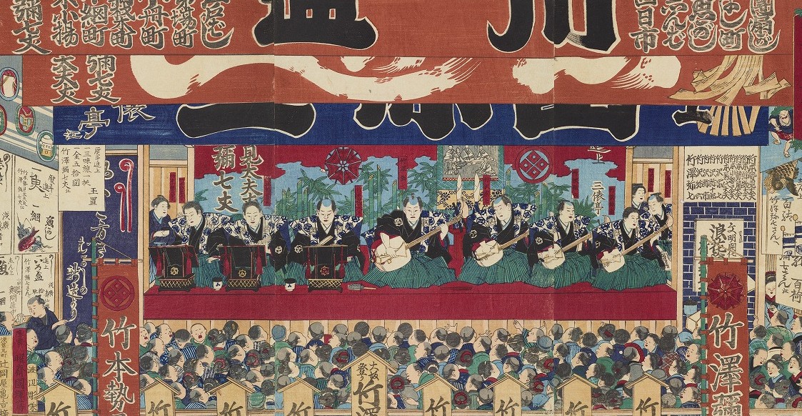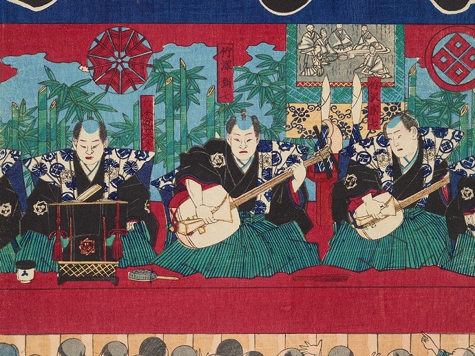 本図は明治7年(1874)に江戸で制作された、二代目歌川国輝による『大坂登り博覧会竹澤連』です。中央に描かれているのは、義太夫節の三味線の名手、七代目竹澤弥七です【図2】。弥七は一般的な三味線の倍以上の大きさの「大三味線」を操ることで知られた上方の人気者でした。